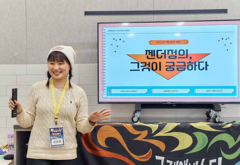 2월의 마지막 금요일, 유스 나잇(Youth night)은 한파와 눈을 뚫고 행사장에 도착한 모두를 환영하며 시작했습니다. 행사에 앞서, 참가자들은 ‘나이에 관계없이 타인의 경험과 지혜를 존중하고 배우고자 하는 자세‘로 ‘서로에게 안전한 공간이 되자‘는 약속문을 함께 읽으며 자유롭게 대화를 나누되 차별과 혐오가 담긴 언행은 하지 않도록 약속했습니다. 홍다예 유스 액티비즘 매니저는 유스 나잇을 ‘인권에 관심이 있는 사람들이 한 자리에 모여서 편안하게 이야기 나눌 수 있는 저녁‘으로 소개하며, ‘더 나은 세상을 만들기 위해 앰네스티와 함께 하고 싶은 것’, ’함께하지 않더라도 만들어보고 싶은 변화‘, ‘함께하고 싶은 행동‘ 등에 대해 이야기 나누는 시간이라고 안내했습니다.