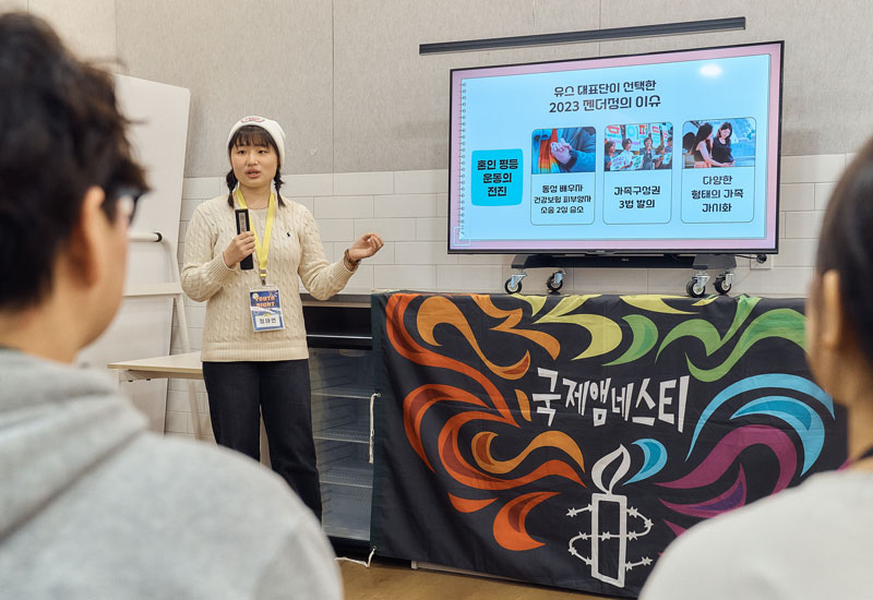 모두의 인권을 지키고자 하는 국제앰네스티는 해당 과정에서 더 많은 유스들이 적극적으로 행동하는 모습을 기대하며, 모든 수준의 거버넌스에서 유스의 관점과 의견을 반영할 것을 추구합니다. 한국지부 또한 앰네스티 거버넌스에 유스의 참여를 확대하기 위하여 ‘유스 대표단’을 선발 및 운영합니다. 유스 대표단은 한국지부 유스를 대표하여 의사결정 기구에 적극적으로 참여하며 유스의 관점과 의견을 앰네스티 활동과 정책에 반영하고, 국제 유스 대표들 및 국내 유스들과 활발하게 교류하며 유스 네트워크를 형성합니다.