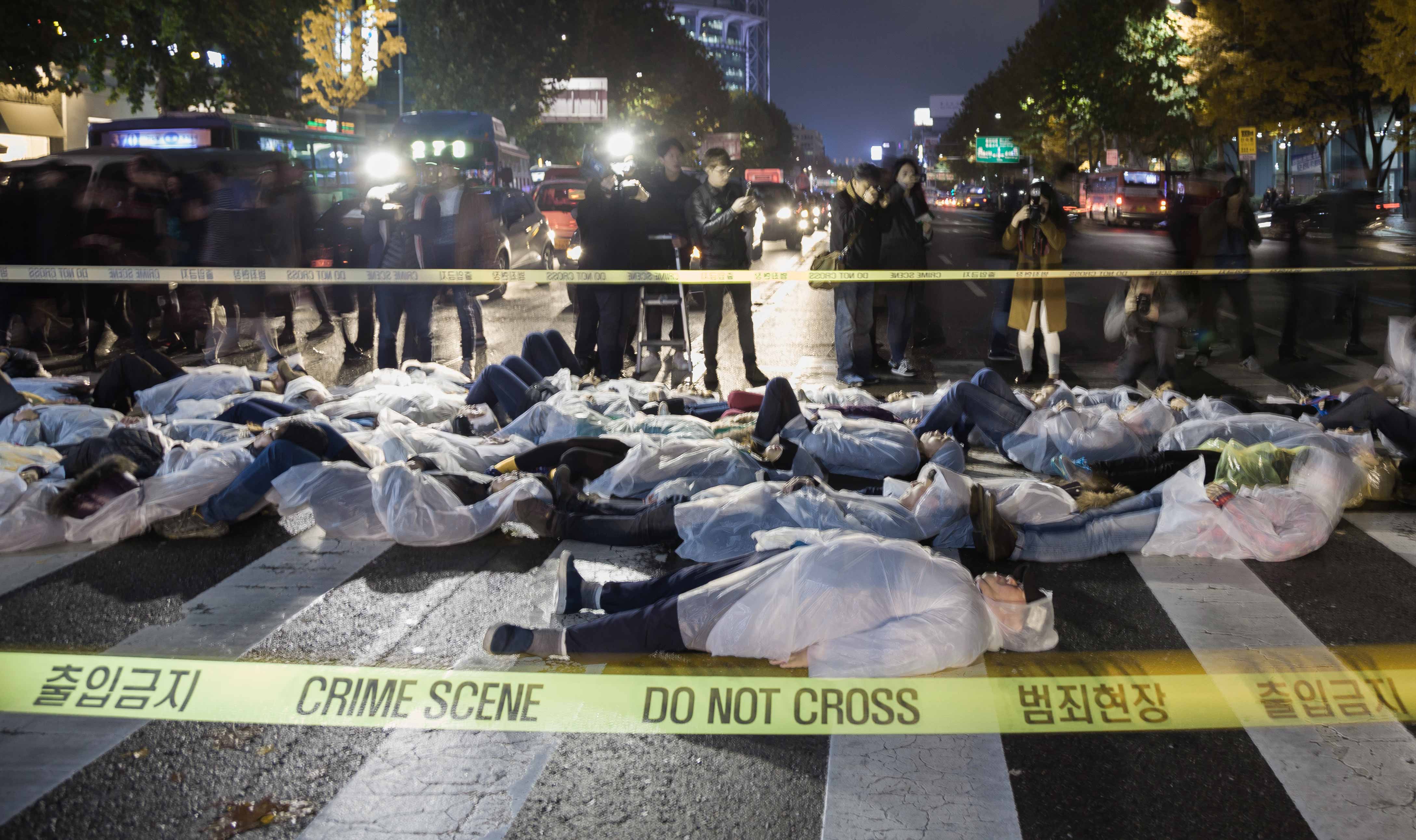 14일 오후 6시 56분 종로 서린교차로 횡단보도에 초록색 보행신호가 켜지자, 흰색 우비를 입은 80여명의 시민들이 거리 위에 쓰러지는 장면을 연출했다. 경찰이 과도하게 물대포를 사용했던 지난해 11월 14일 민중총궐기 집회 현장을 연상시키려는 듯 참가자들은 흰색 우비를 입었고, 그들이 쓰러진 자리에는 범죄현장을 나타내는 현장보존선이 설치됐다.