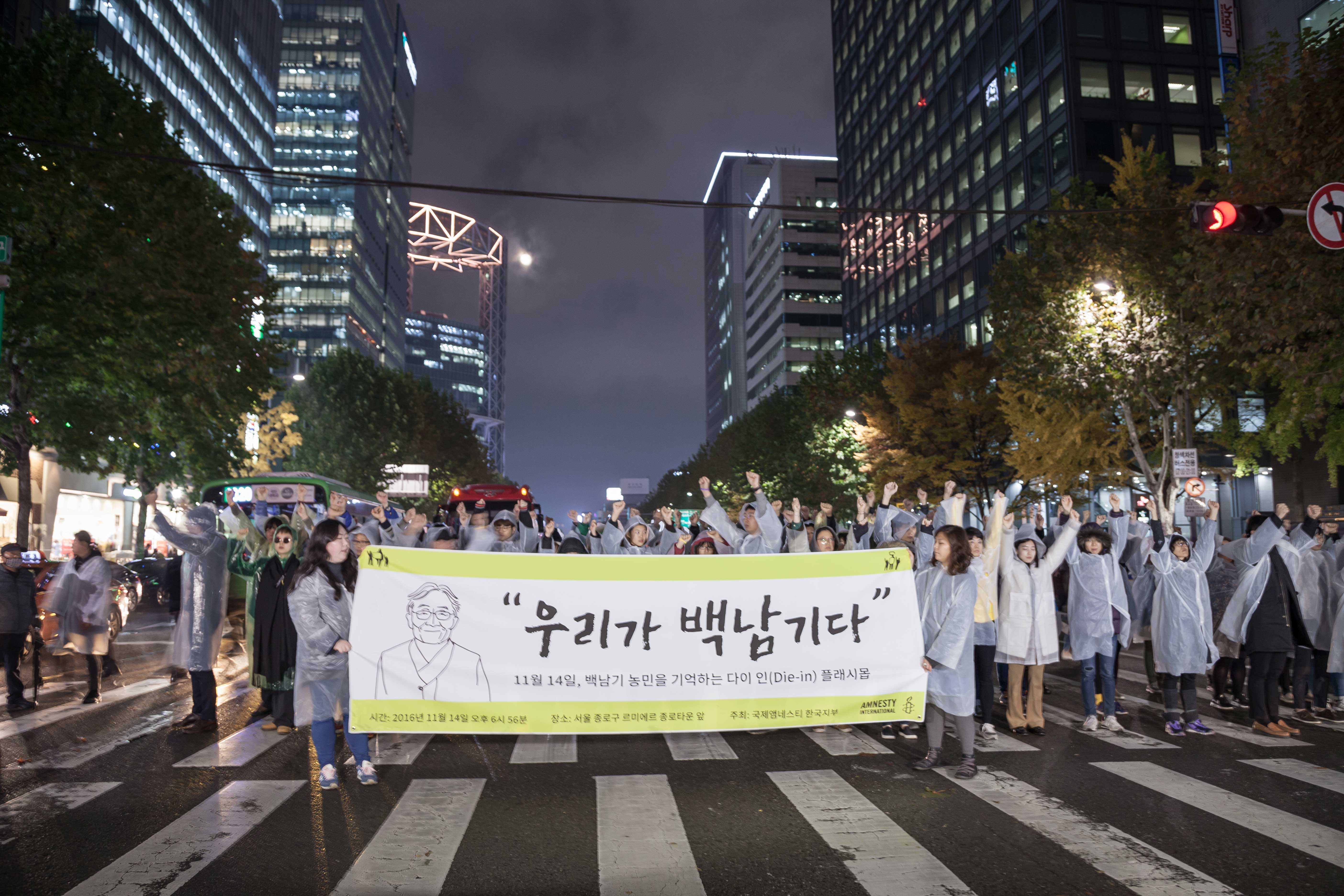Amnesty International Korea gathered people at 6:56 pm on Monday, 14 November, one year on at the exact time and location at which farmer Baek Nam-gi was struck down by police water cannon to perform a ‘die-in’ flash mob performance in his memory. A ‘die-in’ flash mob is a form of nonviolent action in which many people gather together in one location and symbolically act out dying together.