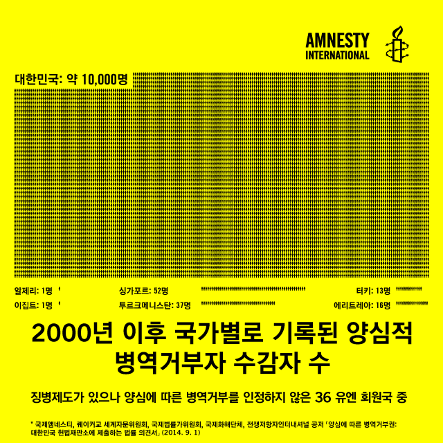 국제앰네스티는 양심에 따른 병역거부권을 인정하고, 수십 년간 이 권리를 행사했다는 이유만으로 수감된 사람들을 모두 석방할 것을 세계 각지에서 촉구해 왔다. 1993년, 국제앰네스티는 양심에 따른 병역거부자 박석진을 즉시 석방하라고 한국 정부에 요구했다. 그는 취조실에 구금되어 48시간동안 밧줄과 쇠사슬에 묶인 채 구타를 당한 것으로 알려졌다. 2004년에는 비폭력과 평화에 대한 신념을 이유로 병역을 거부했다가 수감된 양심에 따른 병역거부자 임태훈의 석방을 요청하는 긴급행동(UA)을 진행했다. 당시 임태훈은 국제앰네스티 한국지부 LGBT그룹의 대표였다.