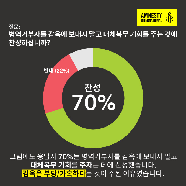 국제앰네스티는 여론조사 의뢰를 통해 “국민적 우려”를 이유로 내세우는 정부의 주장과는 달리 여론도 대체복무제 도입을 지지하고 있다는 사실을 증명했다. 2016년 5월 10일 발표된 조사 결과에 따르면 응답자 중 70%가 양심에 따른 병역거부자를 감옥에 보내는 대신 대체복무제를 도입해야 한다는 쪽에 찬성하는 의견을 보였다.