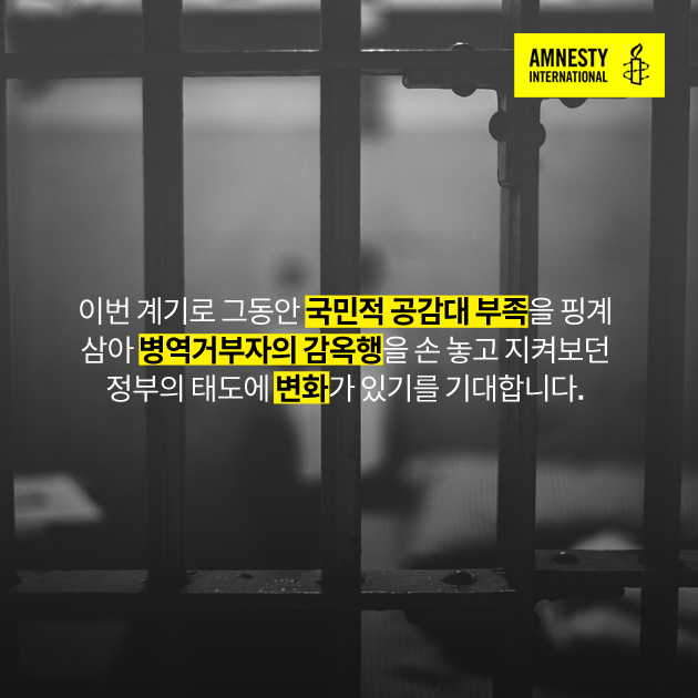 한국인들은 노동권을 얻고 독재정권을 무너뜨리기까지, 도덕적으로 옳지 않다고 생각하는 사람들의 노력으로 각계각층에서 중대한 인권침해에 맞서 싸워 승리했으며, 이 모든 것은 역사가 되었다. 사상과 양심, 종교의 자유를 행사했다는 이유만으로 청년들을 감옥에 보내는 관행 역시 역사의 뒤안길로 사라져야 할 것이다.”