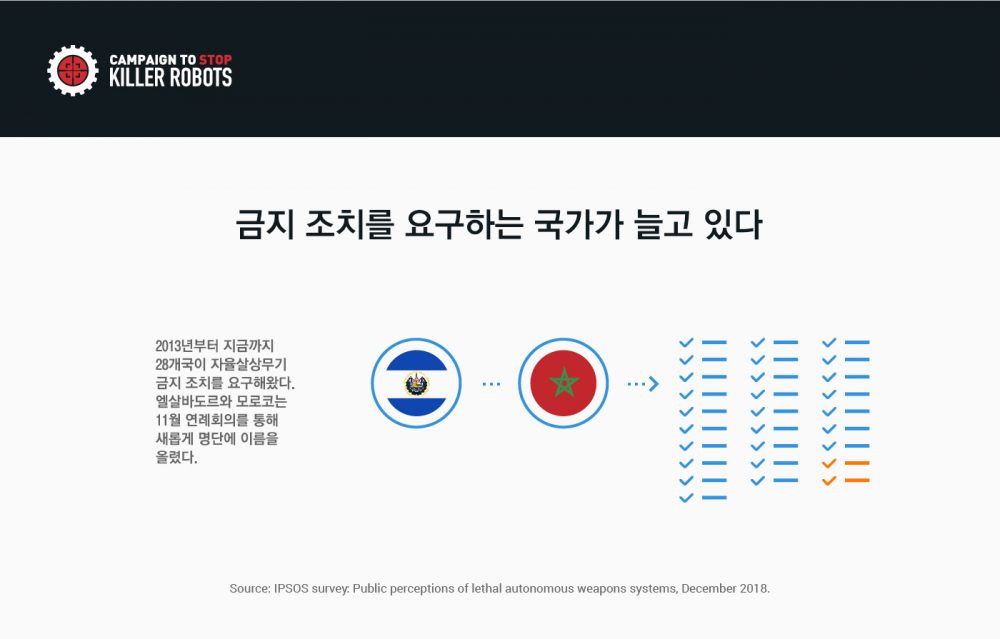현재 28개국이 자율살상무기 금지를 지지하고 있다. 오스트리아, 브라질, 칠레는 무기 시스템의 “중요 기능에 대하여 인간이 의미 있는 통제를 할 수 있도록 보장하는 법적 구속력이 있는 제도”를 시급히 협상할 것을 공식적으로 제안했다.