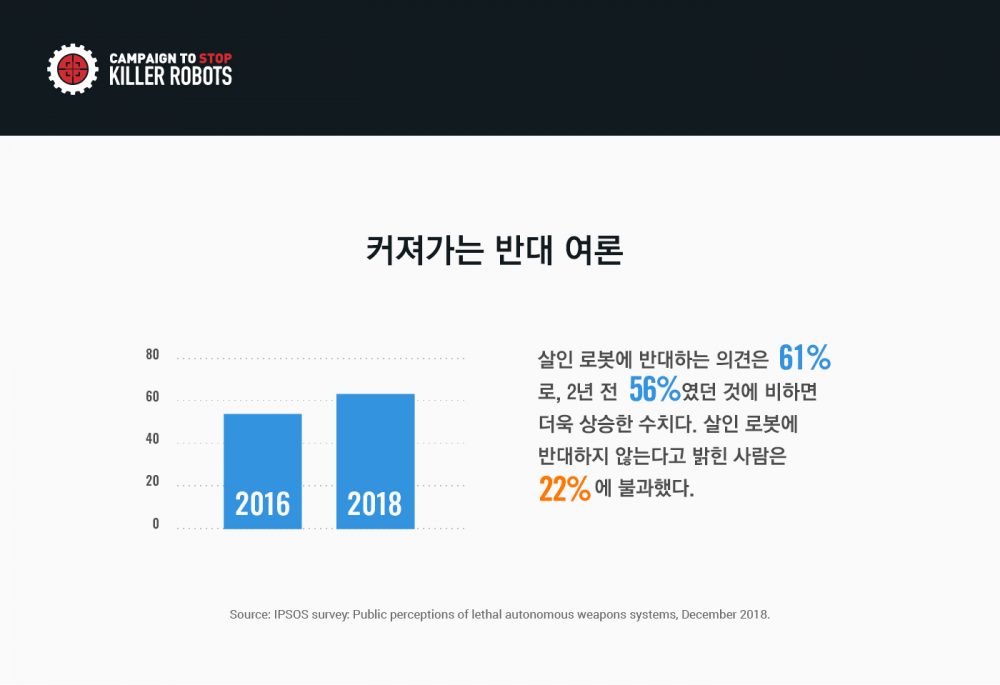 - 2018년 26개국을 대상으로 설문한 결과, 5명 중 3명 이상(61%)이 자율살상무기 개발에 반대했다.