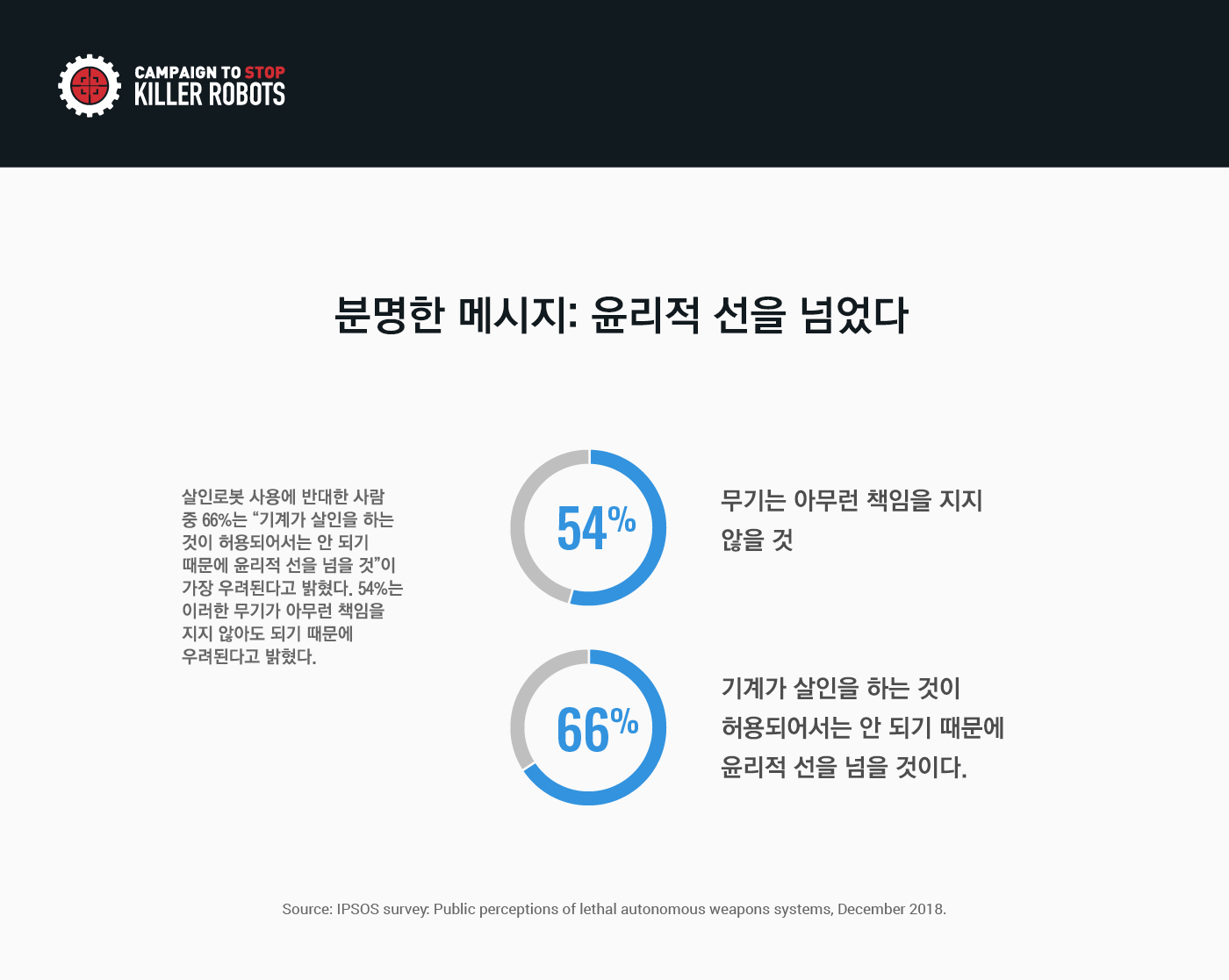 - 자율살상무기 개발에 반대하는 사람 중 3분의 2(66%)는 이렇게 개발된 무기가 “기계가 살인을 하는 것은 허용되어서는 안 되기 때문에 윤리적 선을 넘을 것”이라는 점을 가장 우려했다.