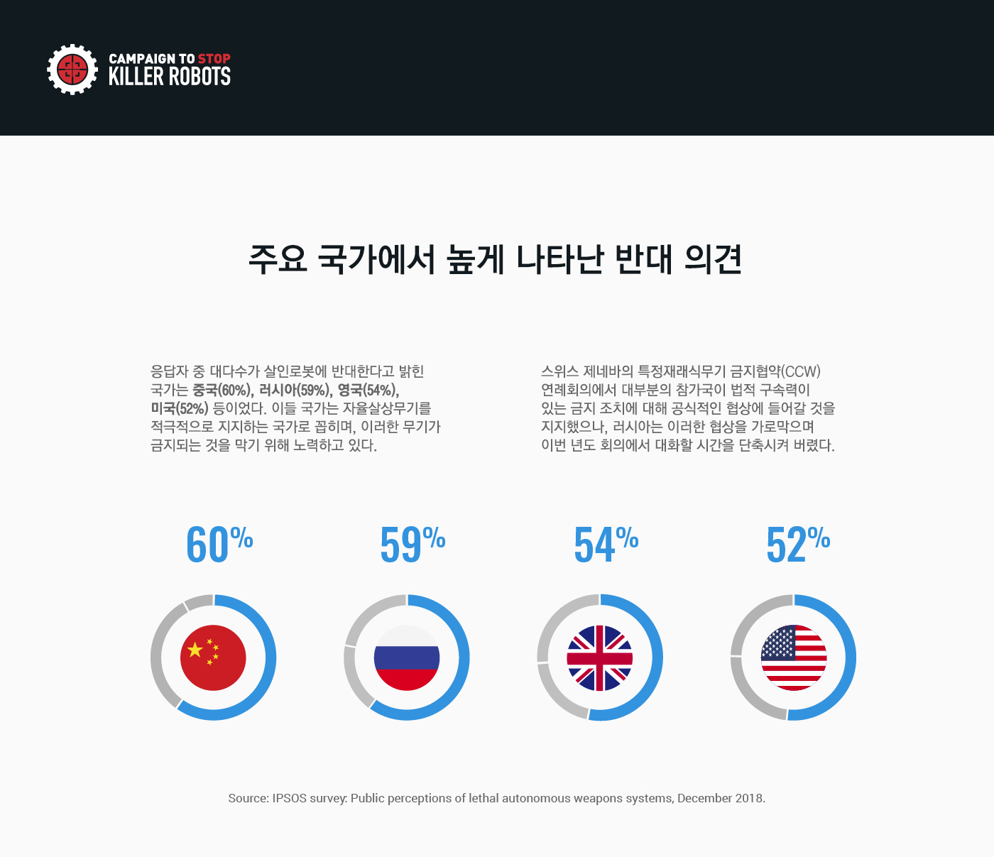 - 응답자 중 절반 이상이 살인 로봇에 반대한다고 밝힌 국가는 중국(60%), 러시아(59%), 프랑스(59%), 미국(52%) 등이었다.