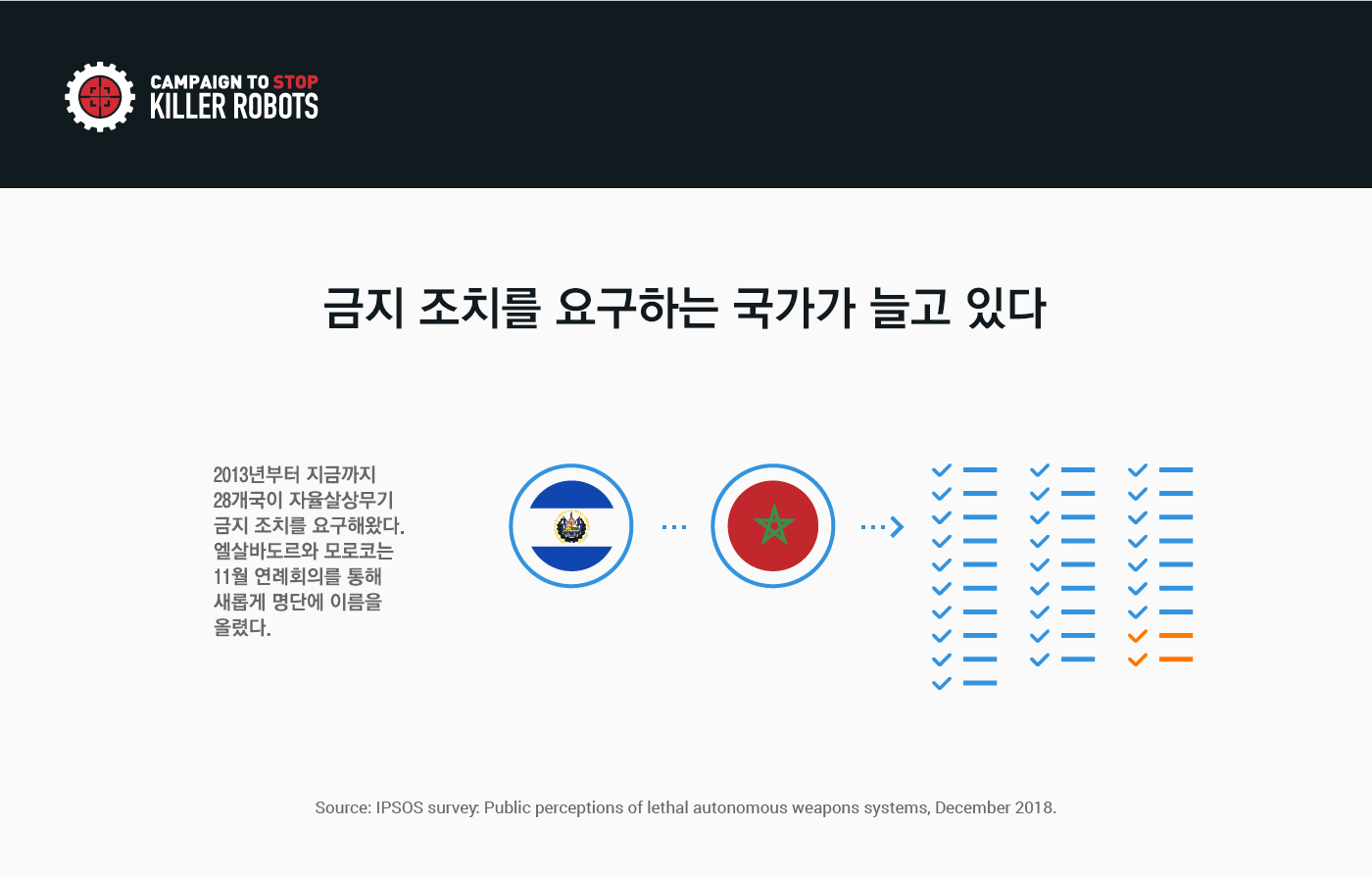 그러나 2018년 11월 특정재래식무기 금지협약 체결국 연례회의에 참석한 일부 국가들은 만장일치 규칙을 이용해 외교적 진전을 방해하기도 했다. 이 회의에서 러시아, 이스라엘, 한국, 미국은 새로운 조약 협상을 지지하지 않겠다는 뜻을 밝혔다. 하지만, 여론조사 결과 러시아(59%)와 미국(52%) 응답자의 절반 이상이 자율살상무기에 반대하는 것으로 나타났다. 이외에도 응답자 중 절반 이상이 자율살상무기에 반대한 국가는 중국(60%), 한국(74%), 영국(54%)이었으나, 이들 국가는 자율살상무기 기술 개발에 주도적인 역할을 하고 있다.
