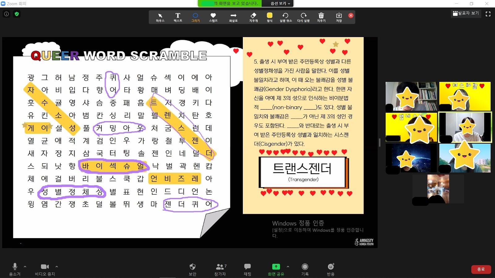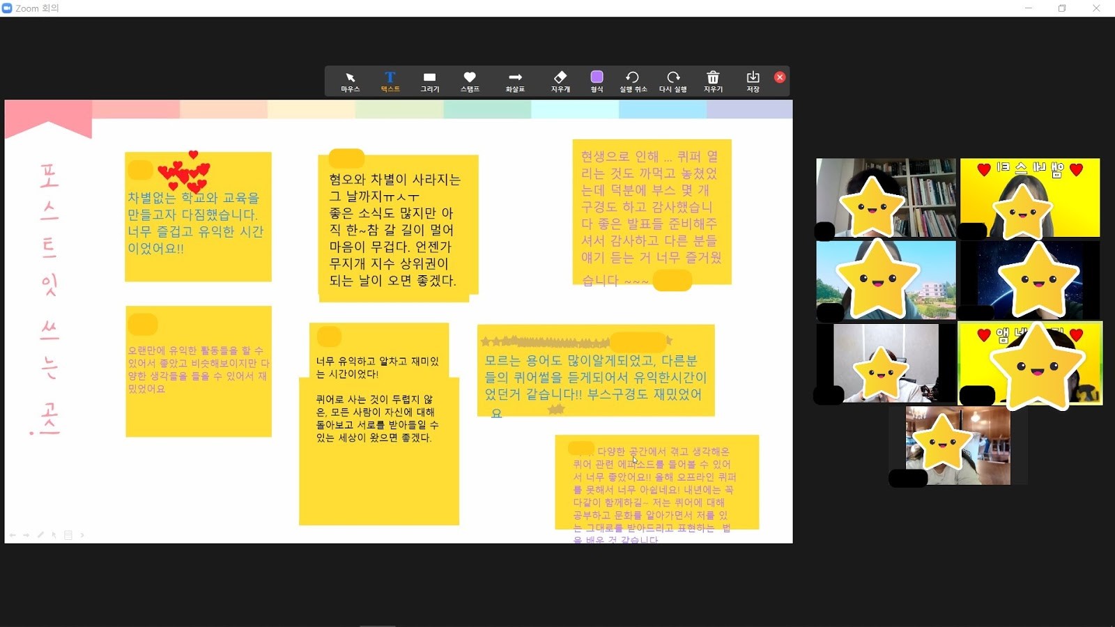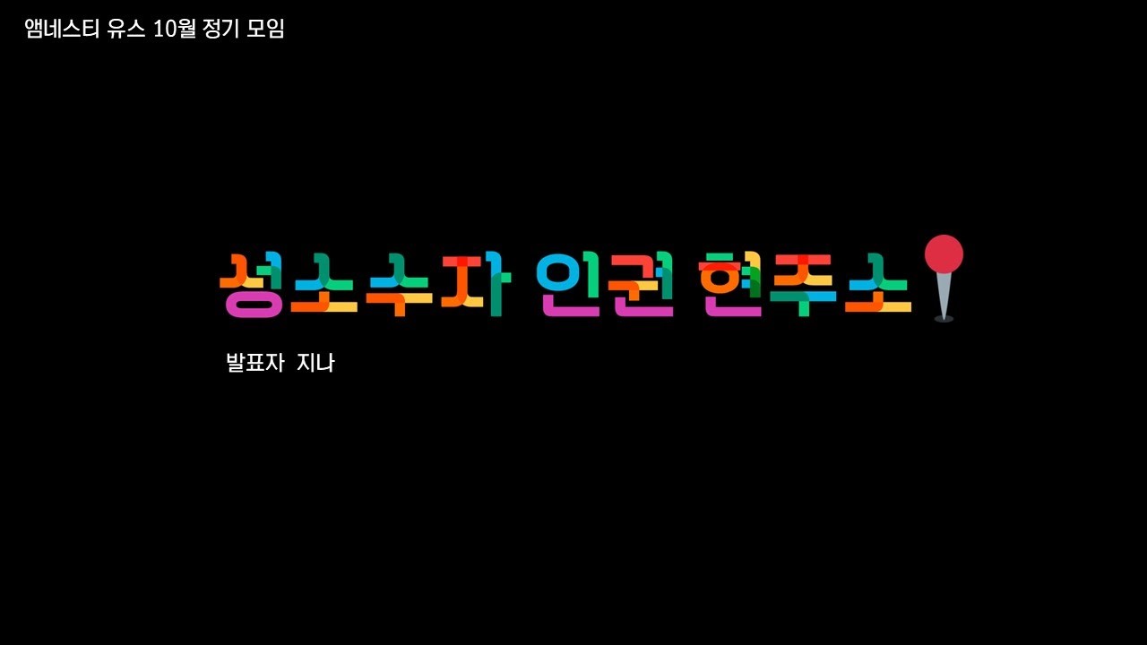 10월 정기 모임은 성소수자를 주제로 다양한 활동을 온라인으로 진행했습니다. 성소수자 관련 개념에 대해 알아가는 시간인 “퀴어 단어 퍼즐” 활동을 시작으로 SOGI법정책연구회 연구보고서 「한국 LGBTI 인권현황 2019」를 참고한 “성소수자 인권 현주소”에 대한 발제, 서울퀴어문화축제 온라인 부스 체험기를 공유하는 시간을 가졌습니다. 마지막으로 포스트잇에 소감을 적고 이야기를 나눴습니다.