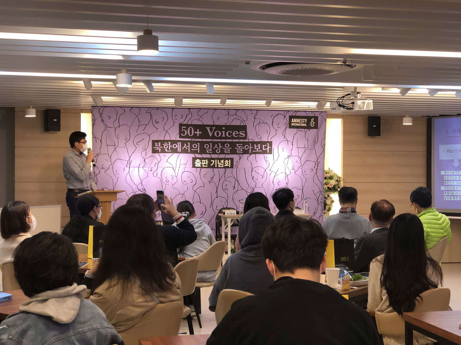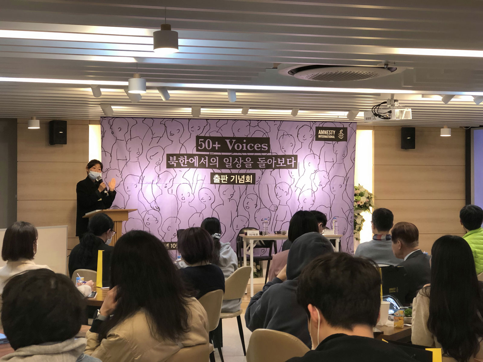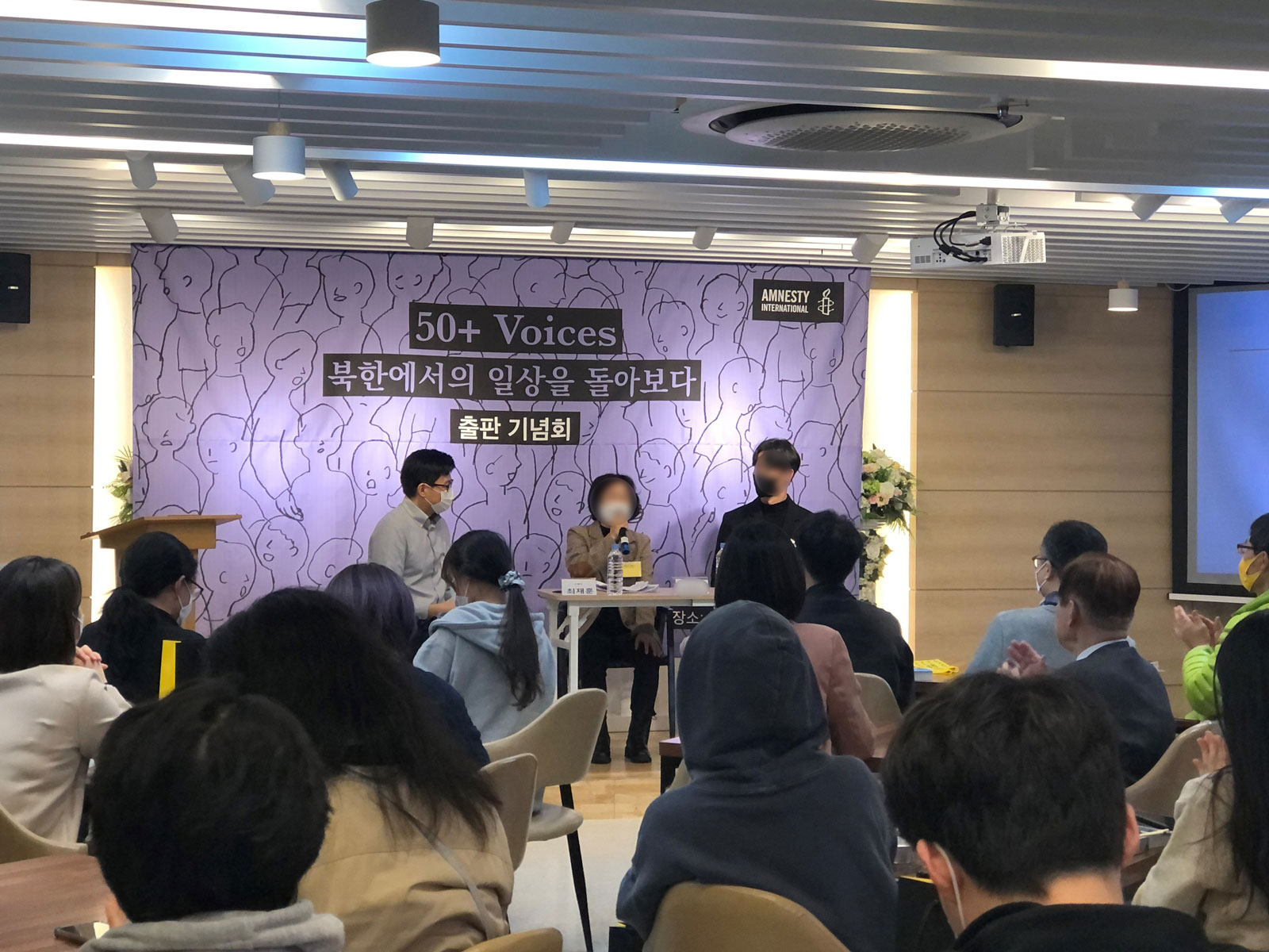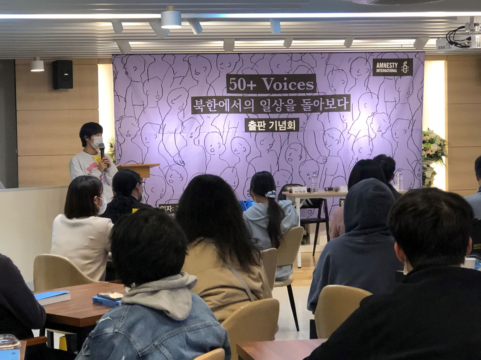 지난 2022년 10월 26일 저녁 7시, 서울 모처에서 국제앰네스티 한국지부(이하 한국지부) 주최로 북한인권 증언집 『50+ Voices』 출판 기념회가 열렸습니다. 이번 출판 기념회는 패널과 참석자 간 소통을 중점에 둔 프로그램 성격 상 최대 50명의 인원에 맞게 애초 기획되었습니다. 그러나 많은 분들이 뜨거운 관심을 보내 주셨고, 신청 초과로 참석 신청이 조기 종료된 후에도 참석 가능 여부를 묻는 문의가 줄을 이었습니다.