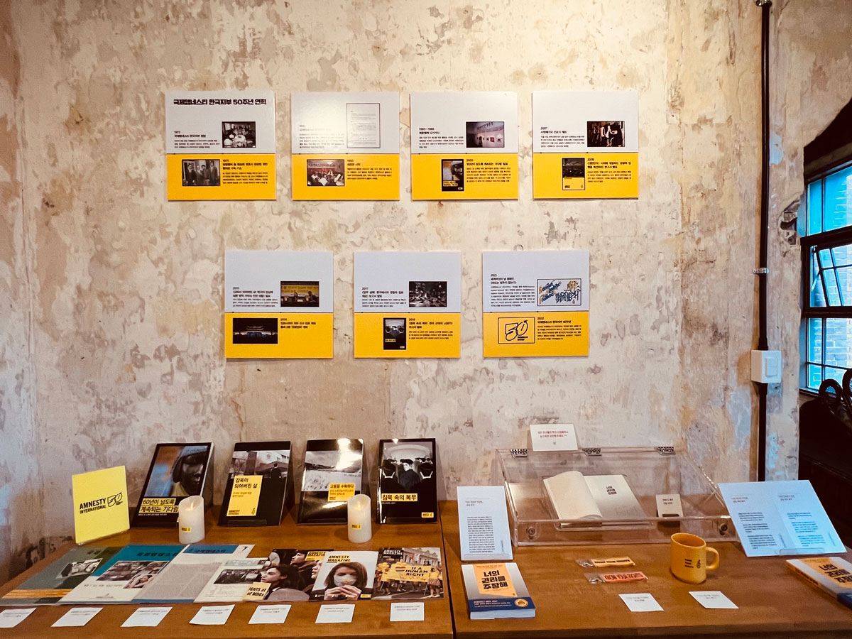 또한, 국제앰네스티 한국지부의 50년 역사를 한눈에 볼 수 있는 공간도 마련되어 있습니다. 그동안 국제앰네스티 한국지부의 50년 역사를 한눈에 볼 수 있는 연혁과 그 동안 발행된 한국지부의 소식지들도 함께 볼 수 있습니다.