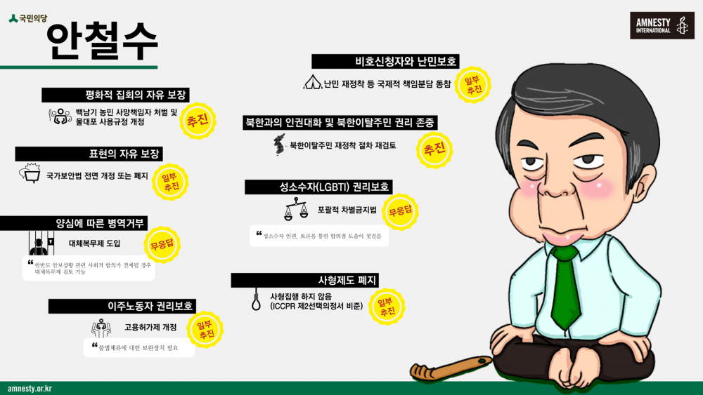 아래의 내용은 국제앰네스티가 선정한 차기 한국 정부의 8대 인권의제를 원내 5개 정당의 대통령 후보자 대선캠프에 질의하여 답을 받은 것이다. 의제에 대한 상세한 입장은 일부 오탈자 교정을 제외하고 국제앰네스티 한국지부가 받은 전문을 그대로 싣는다. 표에 이름이 없는 경우는 각 캠프에서 응답시 표시하지 않은 것을 그대로 반영하였다.