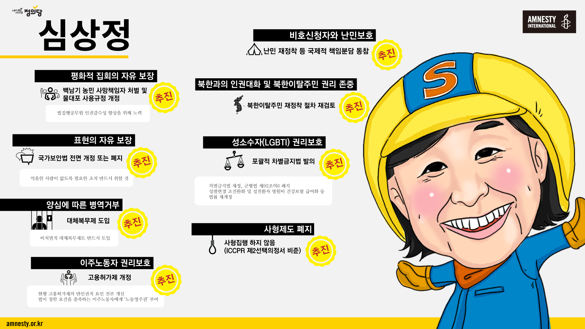 국제앰네스티의 인도주의적 요구에 동의함. 다만 남북의 적대상황과 글로벌 테러리즘을 고려해 일부 제한이 있을 수 있다는 것은 이해되어야 함