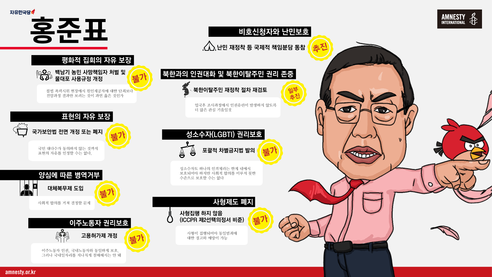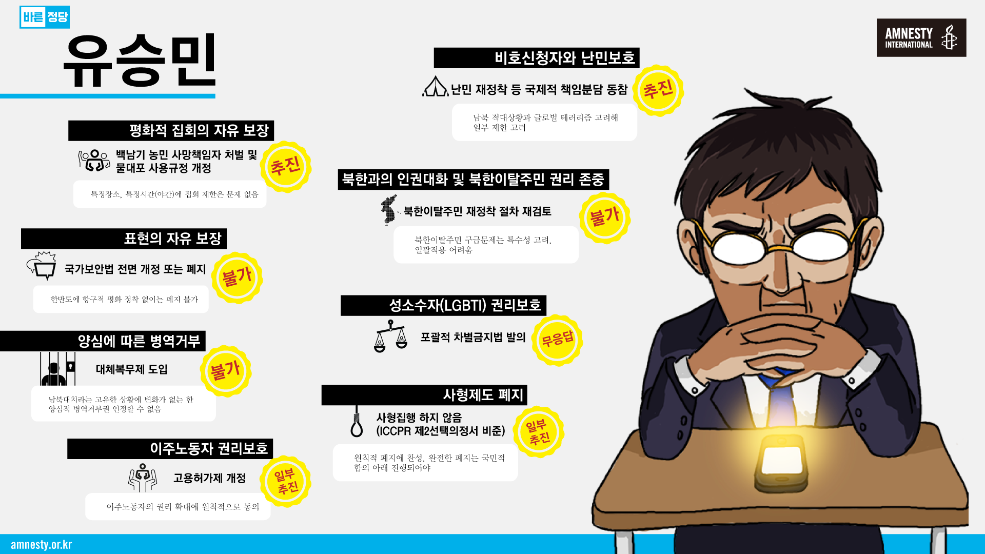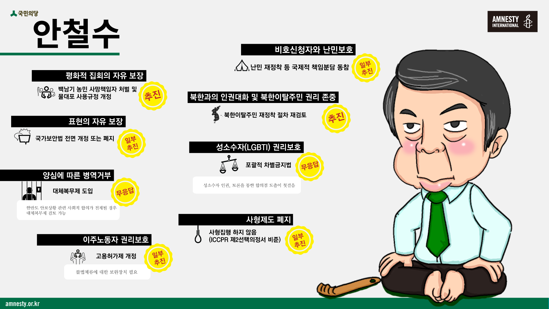 아래의 내용은 국제앰네스티가 선정한 차기 한국 정부의 8대 인권의제를 원내 5개 정당의 대통령 후보자 대선캠프에 질의하여 답을 받은 것이다. 의제에 대한 상세한 입장은 일부 오탈자 교정을 제외하고 국제앰네스티 한국지부가 받은 전문을 그대로 싣는다. 표에 이름이 없는 경우는 각 캠프에서 응답시 표시하지 않은 것을 그대로 반영하였다.