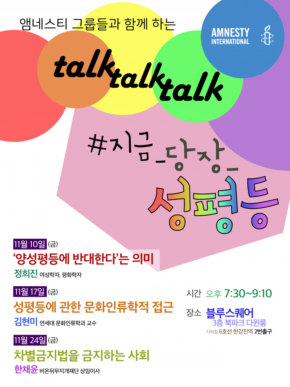 오픈 토크 주제는 #지금_당장_성평등 이며, 각 분야의 전문가를 모시고 3회에 걸쳐 이야기를 나누는 시간이 될 것 같습니다.