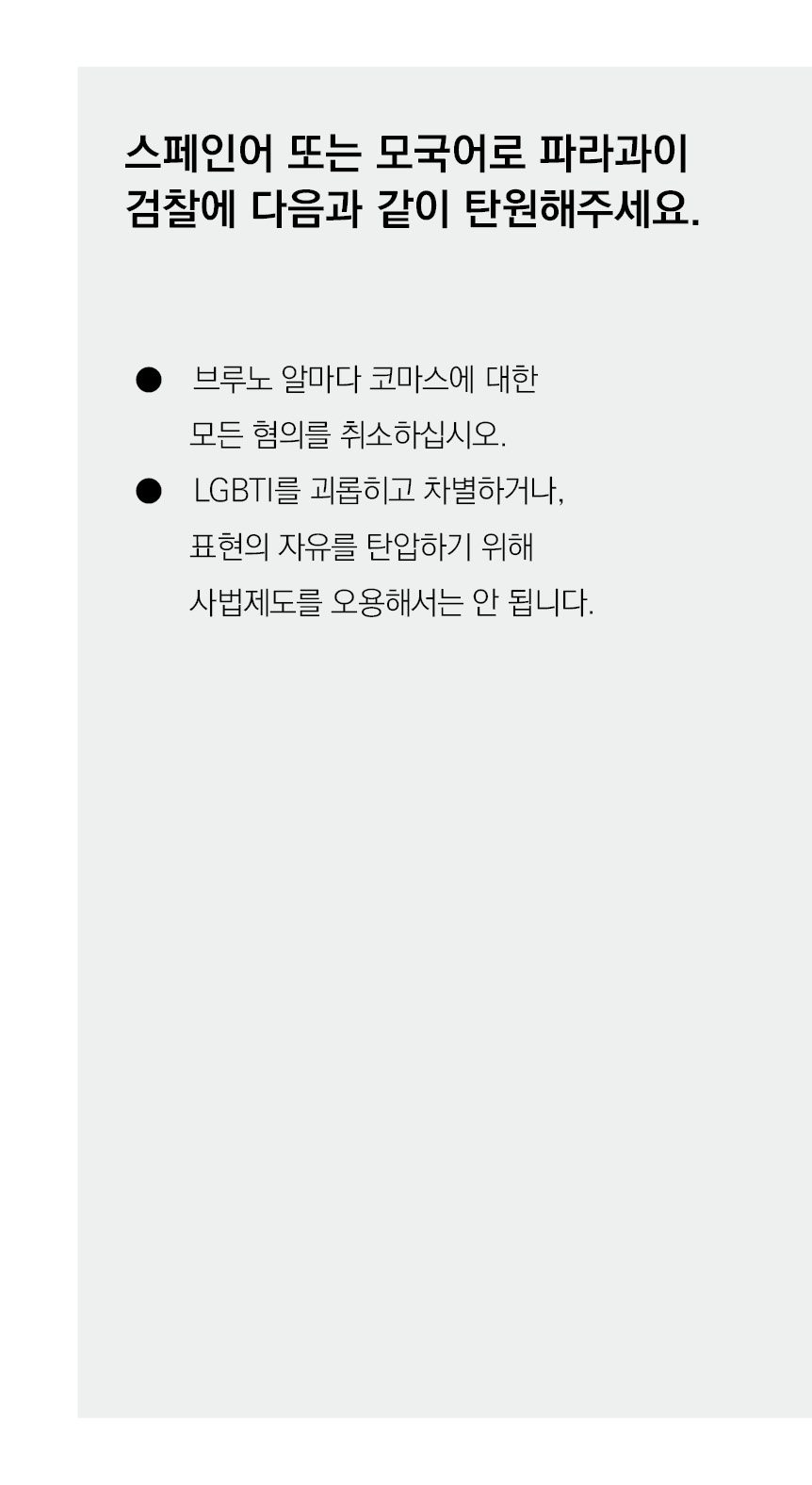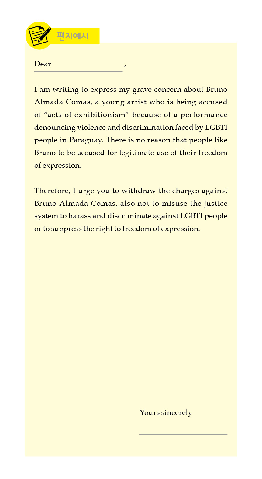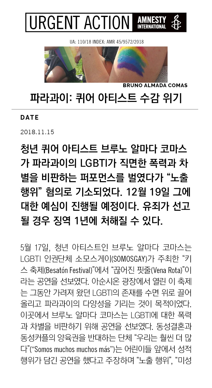 청년 퀴어 아티스트 브루노 알마다 코마스가 파라과이의 LGBTI가 직면한 폭력과 차별을 비판하는 퍼포먼스를 벌였다가 “노출 행위” 혐의로 기소되었다. 12월 19일 그에 대한 예심이 진행될 예정이다. 유죄가 선고될 경우 징역 1년에 처해질 수 있다.