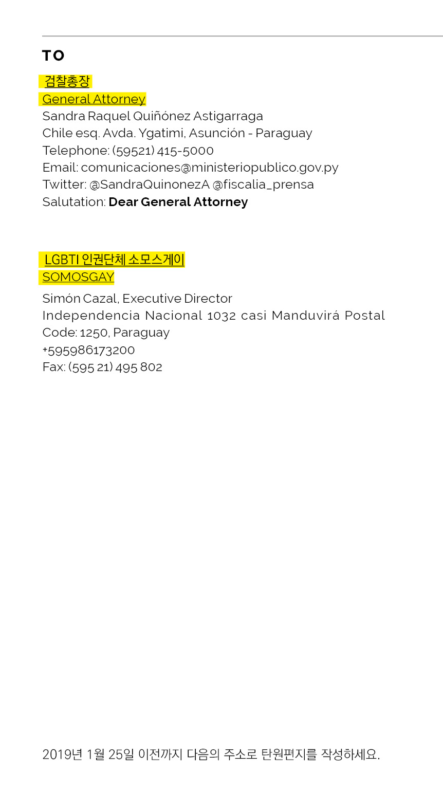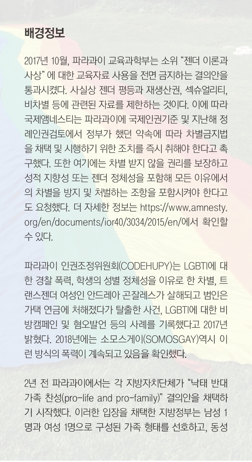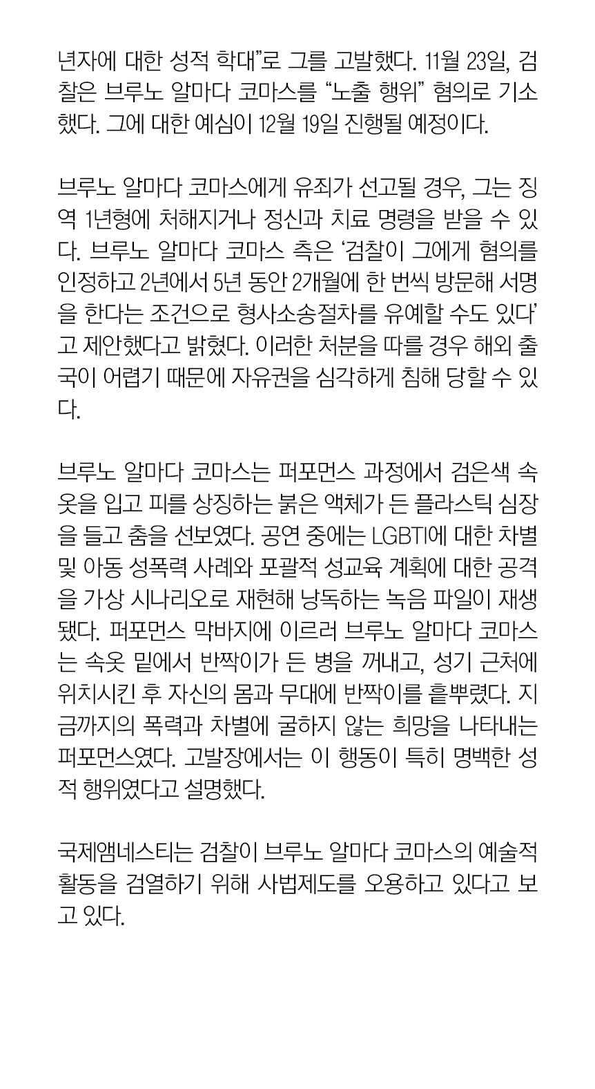 청년 퀴어 아티스트 브루노 알마다 코마스가 파라과이의 LGBTI가 직면한 폭력과 차별을 비판하는 퍼포먼스를 벌였다가 “노출 행위” 혐의로 기소되었다. 12월 19일 그에 대한 예심이 진행될 예정이다. 유죄가 선고될 경우 징역 1년에 처해질 수 있다.